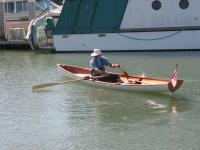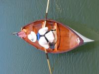 The last step was to Varnish and paint the boat. We decided to paint the hull traditional white, and we varnished the inside. The boat has an incredibly shallow draft and can take the weight of two people without any trouble at all. It is a little unstable but has no problem taking light chop (not shown). The boat is fast and straight and tends to want to keep going. With one person on the oars and waiting three seconds between pulls I was able to maintain around 4.5 to 5 knots. With two people on the oars we can maintain 5 knots, maybe slightly faster. It took surprisingly little effort to row around (it's faster then a canoe). We're calling this one a success.