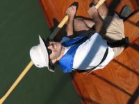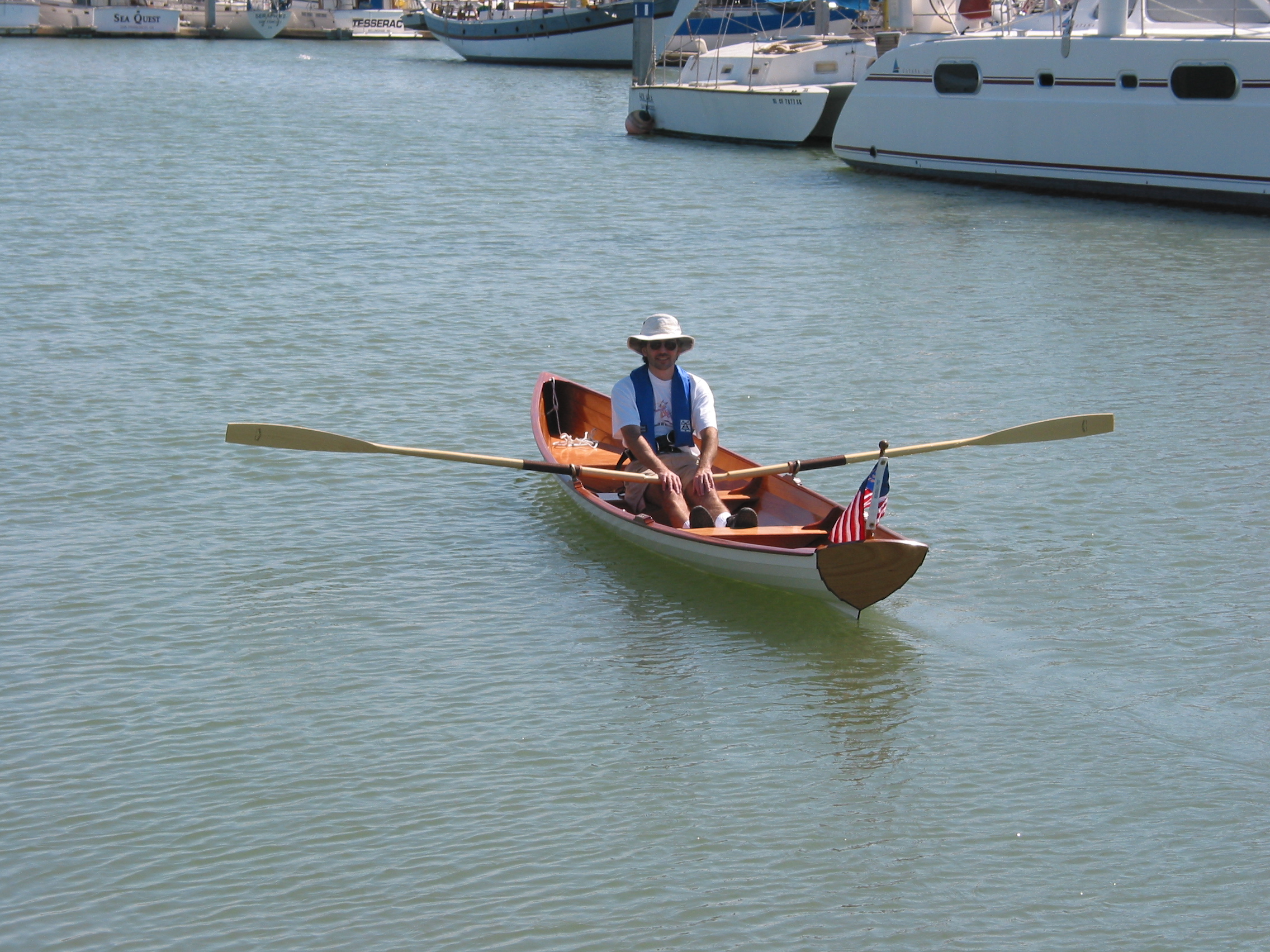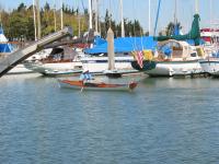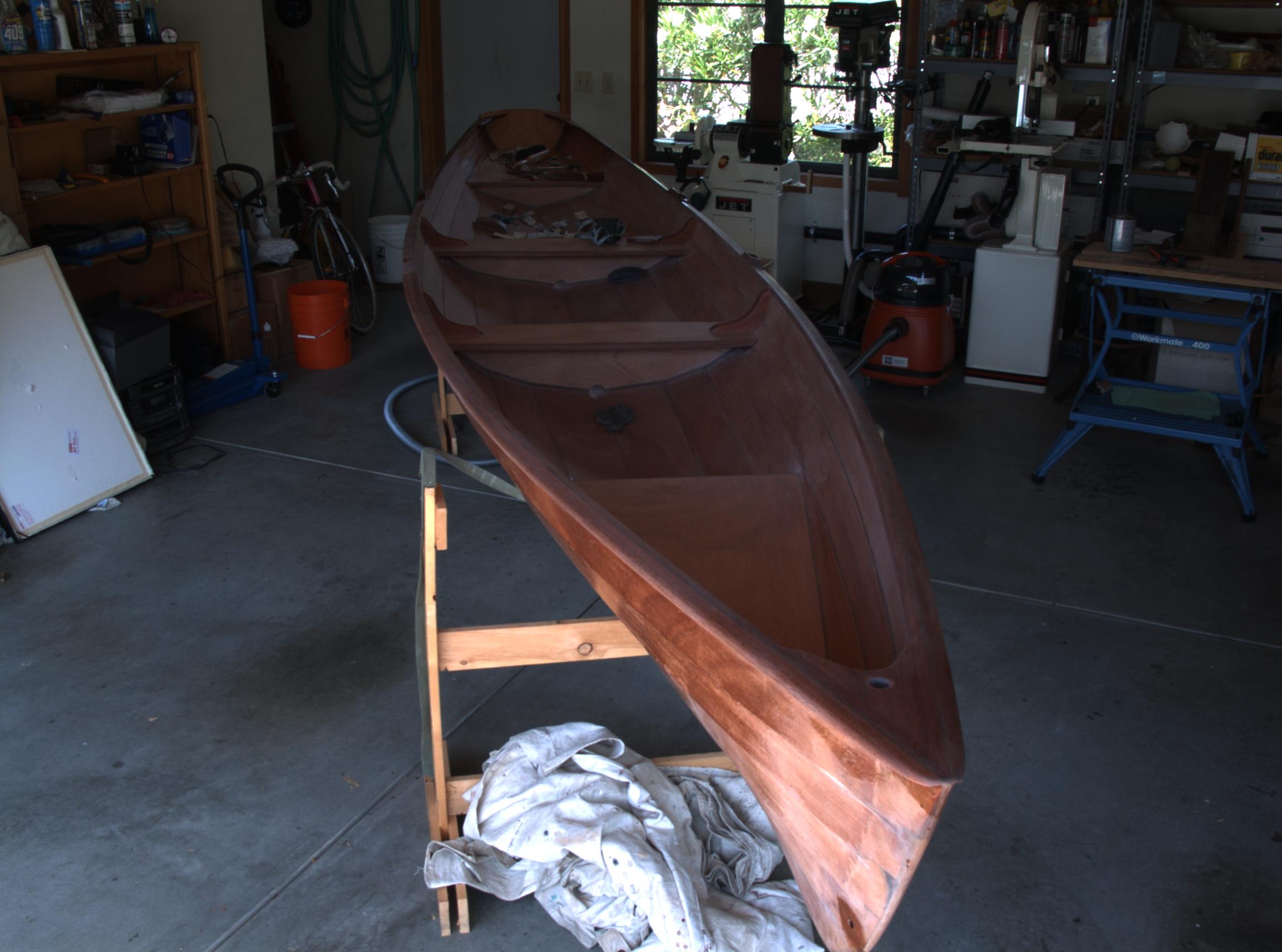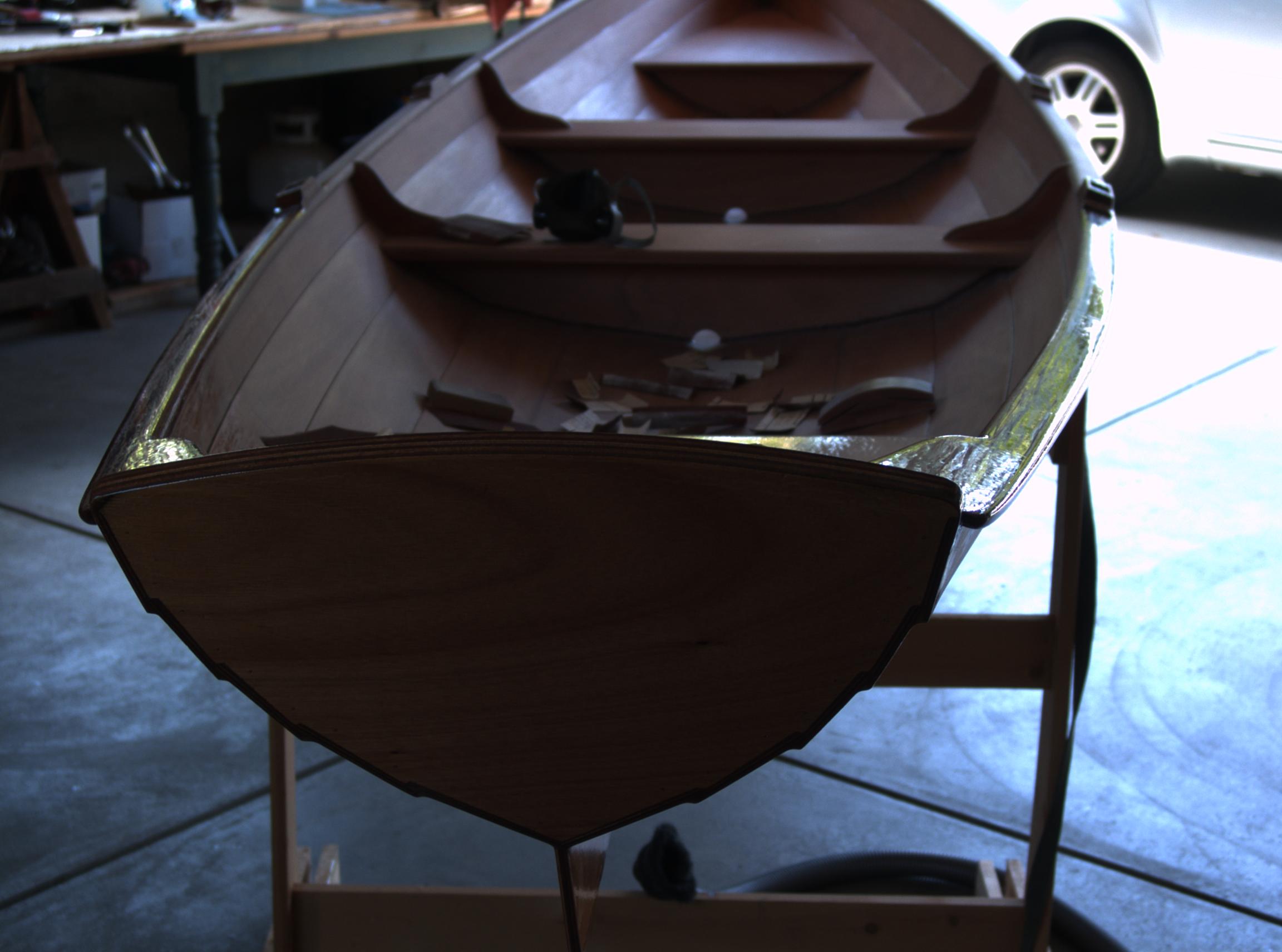The last step was to Varnish and paint the boat. We decided to paint the hull traditional white, and we varnished the inside. The boat has an incredibly shallow draft and can take the weight of two people without any trouble at all. It is a little unstable but has no problem taking light chop (not shown). The boat is fast and straight and tends to want to keep going. With one person on the oars and waiting three seconds between pulls I was able to maintain around 4.5 to 5 knots. With two people on the oars we can maintain 5 knots, maybe slightly faster. It took surprisingly little effort to row around (it's faster then a canoe). We're calling this one a success.